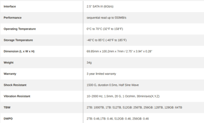 - DWPD: 2TB: 0.46,1TB: 0.46, 512GB: 0.46, 256GB: 0.46